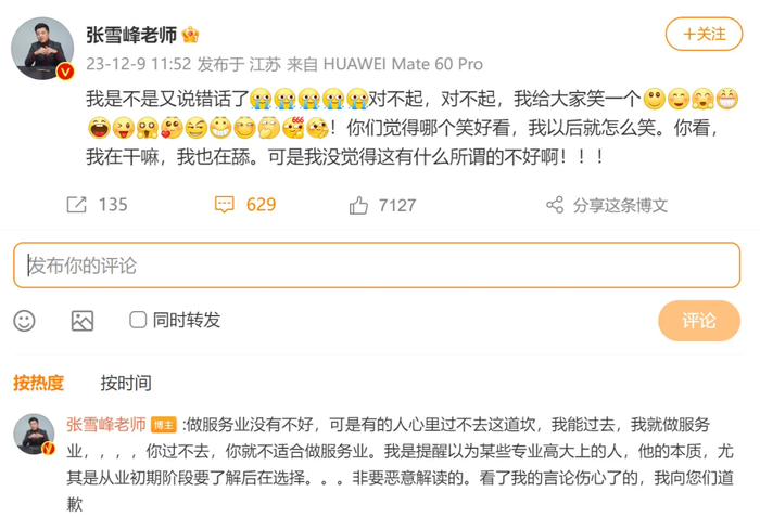 事实上,12月9日张雪峰的公开道歉,仍不失油嘴滑舌之态。个人认为是给他减分的!