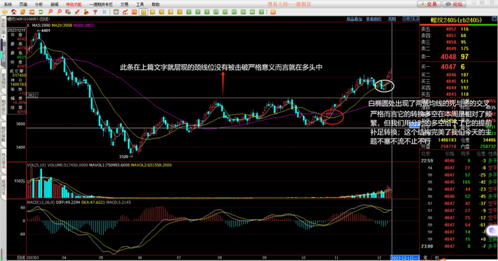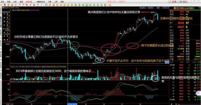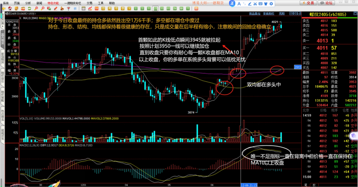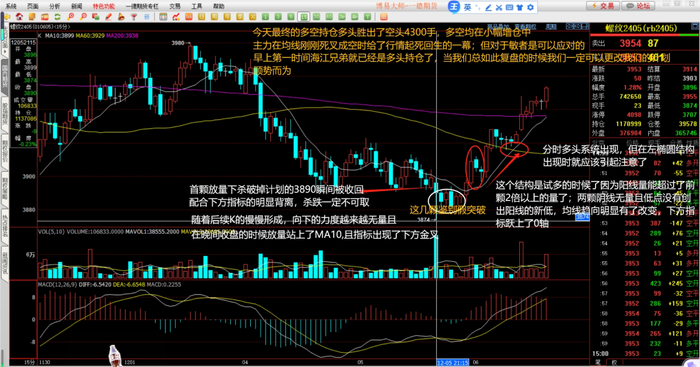 看过持仓的变化,它只是象征性地告诉我们多头在行情中稍占优势(因为相差不过2万手的持仓都是相较均衡的);守望实时的行情,应用我们一直的系统研判(尤其在这一周十字路口的提示下:行情必须出现不空即多或不多即空的选择)是可以清晰地研判出3874是假突破的主力行为:放量突破应该顺势而下,但后续的连续K没有任何一颗再破低点3880,且此时下方指标出席那了背离与金叉态势,更是在后续第六颗K就放出了它前颗5倍的量能站上了我们的MA10且将趋向有了改变的意味。这样量能的出现与均线趋向的变化与支撑形成还有计划的3890多空介质点上收盘,行情的破大概率就是假动作了。这个时候你虽然没有买在低点,但相较趋势的形成幅度一定是可以忽略不计的。请记住我们曾经的文字唯慢不破、不破不立还有当下的不塞不流不止不行,一定会对你以后行情的理解起到非常好的自如之效:行情转折将成为你自然而然应对的事情。