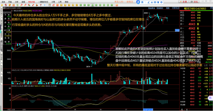 螺纹2405主力合约本周演绎了一颗上影18点下影91点实体74点的周阳线,收盘4042较前周涨了74点,周涨幅1.86%。成交量稍显逊色,但持仓至周五晚间增了近10万手之多。盘中至周五晚间高点4076因量能萎缩而出现相应的回调4047收盘,整体行情而言保持着十字路口突破以来的趋势行进。行情低点3874破掉了我们上周计划中的3880,但仅仅只是分钟的事情,就被放量后拉起;它后续连续4个15分钟K的低点都没有再破3880。你若在后面宝贵的时间里能记忆起曾经的不破不立,亦或我们今天引用的不塞不流不止不行,你就能识别主力破掉3880是它的假动作了。其实在所有的行情中这样的显现是频而又频的,因为只有这样主力才能顺利掏出惊慌中你损掉的原本正确的单子,甚或让你再反手“同向”它的如此短趋势,让你正反抽打自己的资金。不塞不流不止不行,不是常用语,但用它希望你能真正地体悟出我的良苦用心。
