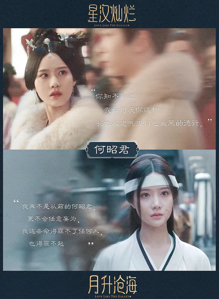 直到去年的热播剧《星汉灿烂》,她饰演的何昭君本是娇蛮任性的天之骄女,经历灭门惨案后迅速蜕变,负起保护幼弟、振兴家族的重任,人物弧光得以展现。