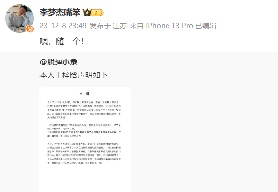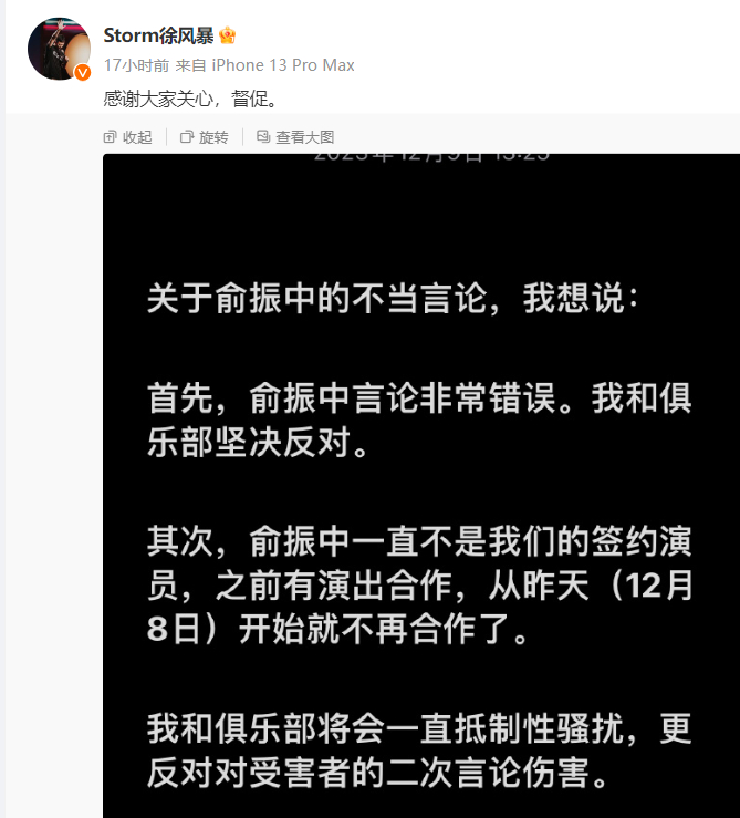 12月9日,喜剧联盒国主理人“Storm徐风暴”在微博发声,称俞振中言论非常错误,“我和俱乐部坚决反对”。在声明中,“Storm徐风暴”称,俞振中一直不是俱乐部的签约演员,只是之前有演出合作,“从12月8日开始就不再合作了。我和俱乐部将会一直抵制性骚扰,更反对对受害者的二次言论伤害。”