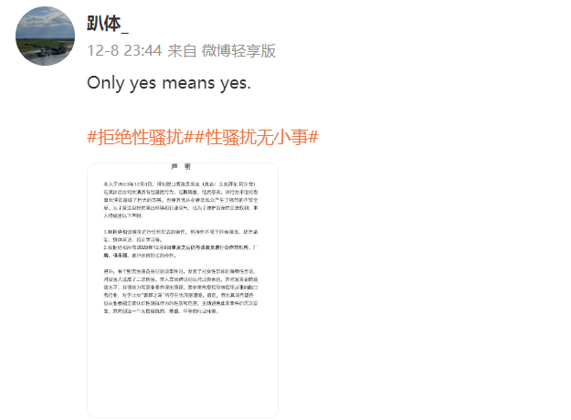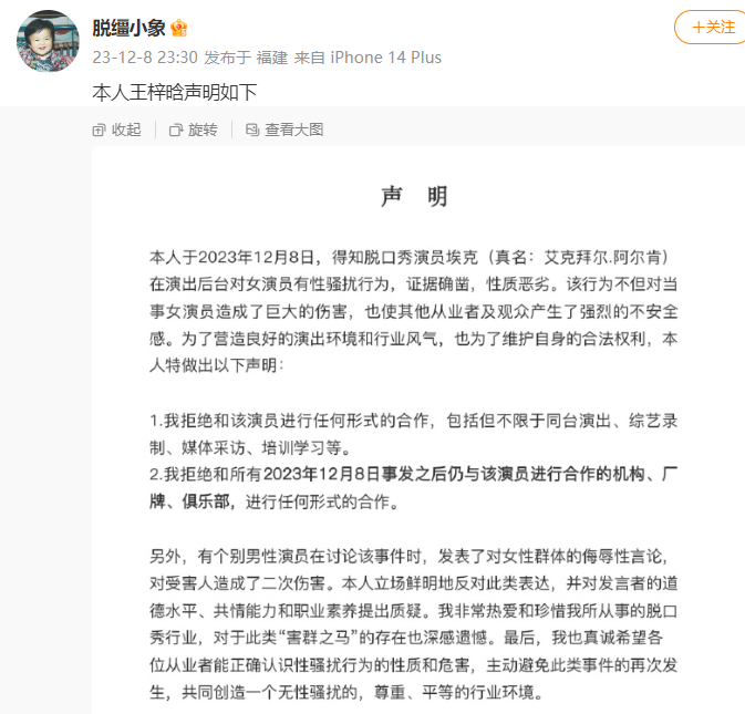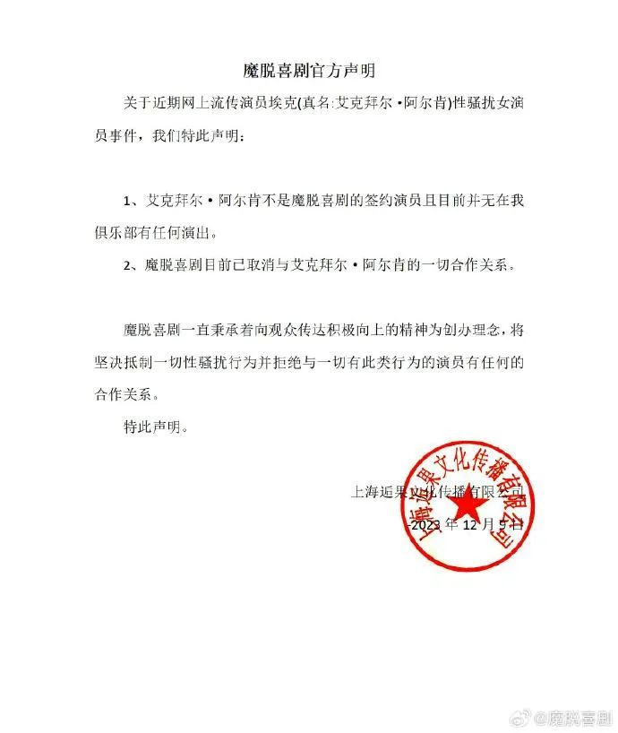 12月9日,魔脱喜剧脱口秀官方微博发布声明,关于近期网上流传演员埃克(真名:艾克拜尔·阿尔肯)性骚扰女演员事件,特此声明: