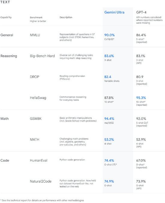Gemini Ultra版本在32个学术基准中,有30个超过GPT4V处于全球最先进水平。据谷歌黑板报,Gemini Ultra 的得分率为 90.0%,是第一个在 MMLU(大规模多任务语言理解)测试中超过人类专家的模型,MMLU 综合使用了数学、物理、历史、法律、医学和伦理等 57 个科目,用于测试世界知识和解决问题的能力,在包括文本和编码在内的一系列基准测试中,Gemini 的性能都超过了当前最先进的水平。