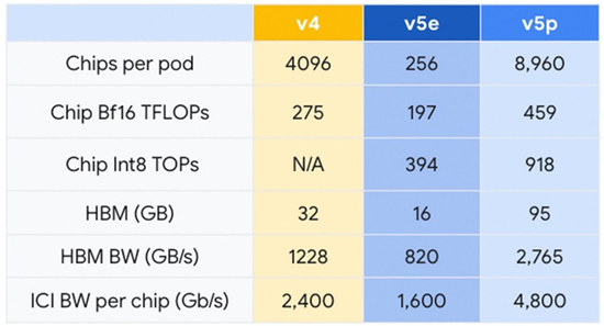 谷歌发布最新款AI芯片——TPU V5p,芯片算力与片间互联能力进一步提升。据谷歌云官网,最新一代TPU V5p单芯片算力达到459TFLOPs(Bf16),最高支持8960片TPU组合超级节点并带来高达4800Gb/s的片间互联速度。