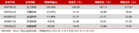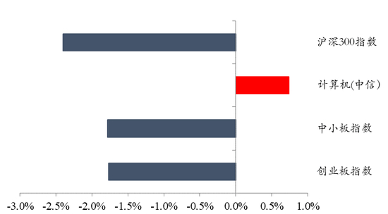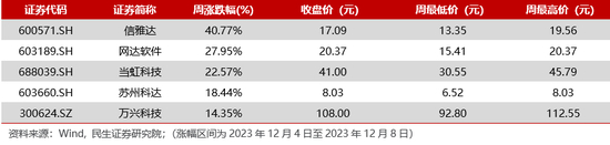本周(12.4-12.8)沪深300指数下跌2.4%,中小板指数下跌1.78%,创业板指数下跌1.77%,计算机(中信)板块上涨0.74%。板块个股涨幅前五名分别为:信雅达、网达软件、当虹科技、苏州科达、万兴科技;跌幅前五名分别为左江科技、万集科技、金溢科技、天迈科技、创意信息。