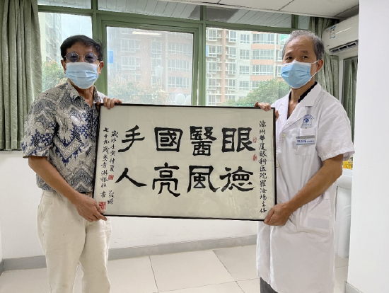 “眼医国手 德风亮人”,在罗添场的诊室里,一幅毛笔字画悬挂墙上,这是一名79岁的患者赠予他的。“当时患者眼睛受伤,多处打听,得知我在漳州华厦眼科医院,特地跑过来找我做手术。”罗添场说,术后患者恢复还可以,很开心,就写这幅书法送给我,现在我们还保持联系。