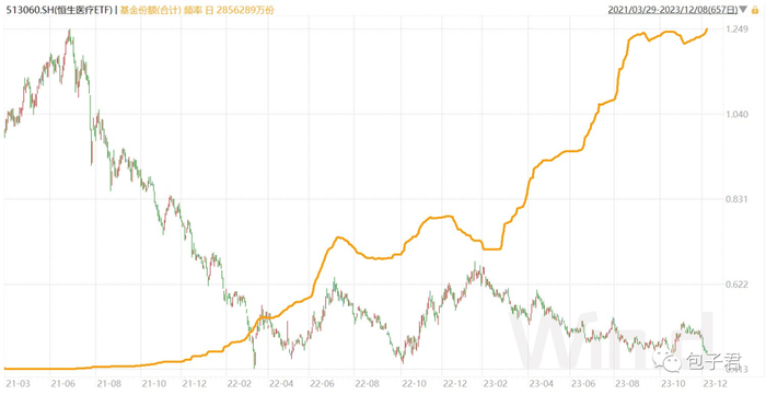 3、恒生医疗年内新低了,这个标的也是一堆人看好,份额一直增,净值不断走低。