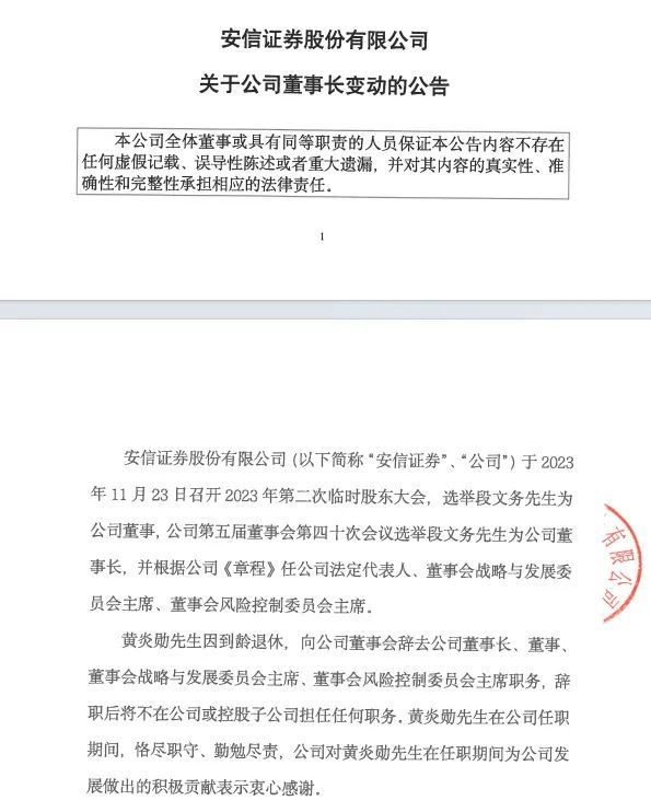 11月24日,安信证券公告称原董事长黄炎勋到龄退休,由段文务担任新一任董事长。