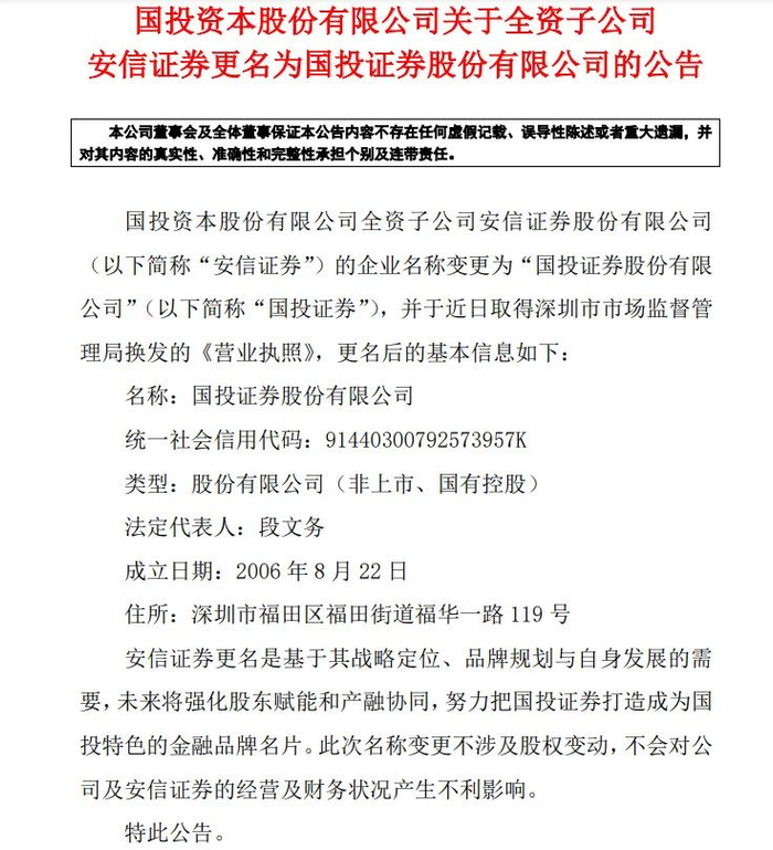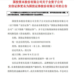 12月8日,国投资本发布公告称,安信证券基于其战略定位、品牌规划与自身发展的需要,现将公司名称由“安信证券股份有限公司”(以下简称“安信证券”)变更为“国投证券股份有限公司”(以下简称“国投证券”),并于近日取得深圳市市场监督管理局换发的《营业执照》。这也意味着安信证券正式更名为国投证券。