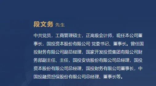 公司官网公开资料显示,段文务为中共党员,工商管理硕士,正高级会计师,现任公司董事长,国投资本股份有限公司党委书记、董事长。曾任国投财务有限公司副总经理,国家开发投资集团有限公司财务部副主任、主任,国投安信股份有限公司总经理,国投资本股份有限公司总经理,国投财务有限公司董事长,中国投融资担保股份有限公司总经理、董事长等。