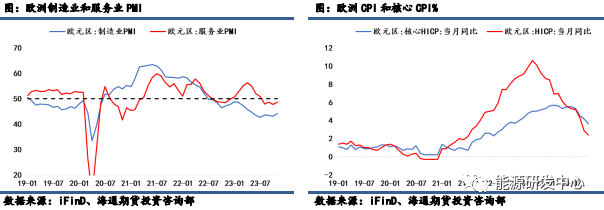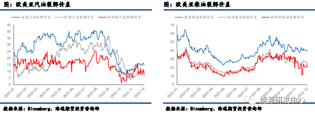 能源通胀虽有逐步缓解的迹象,但成品油需求仍受限制。上半年成品油需求中汽油和航煤需求保持相对高位,而柴油需求则维持弱势。由于疫情后外出驾驶旅游恢复,汽油需求回升较快;而因工业需求较为疲弱使得柴油加工需求回落,且去年进口柴油库存相对较高也放缓了进口节奏。汽油相对柴油偏强,也与欧洲经济中服务业相比制造业偏强的局势相一致,尽管服务业和制造业PMI仍处于50下方。值得注意的是,下半年随着能源价格回落,欧洲CPI和核心CPI同比增速下降幅度较大,11月欧元区11月CPI同比增长2.4%,为2021年7月以来新低;核心CPI同比增长3.6%,增幅连续四个月放缓。由于欧洲通胀水平逐步逼近央行2%的目标,市场预期欧洲将更快进入降息周期,有助于油品需求回升的预期进一步改善。