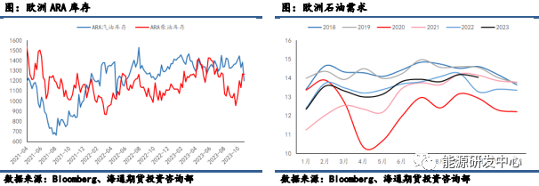 欧洲原油消费占全球比例约为15%,是仅次于亚太和北美的全球第三大消费地区。今年的需求表现中:炼厂加工水平偏弱,港口库存先累库后去库。由于去年俄乌冲突使得欧洲经济相对不景气,经济悲观预期迹象明显,欧洲地区油品的工业需求放缓。但受到欧洲炼能收缩和炼厂检修的双重影响,年内ARA港口的柴油库存有显著减少。1-7月欧洲炼厂加工累计2.4亿吨,同比去年同期2.7亿吨回落13%。值得注意的是,俄乌冲突以来,欧洲寻找其他地区替代俄油,美国已经成为欧盟第一大原油进口来源地,占欧盟市场从冲突前的10%跃升至20%左右。随着原油进出口贸易流的转换,未来欧洲也将继续增加对美国原油的进口份额。