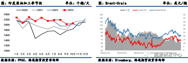 俄油进口折扣幅度收窄,自俄进口份额短暂回落。不比去年印度大幅抢购俄油进口,使得俄罗斯石油进口份额从此前占印度市场仅2%上升至近40%。今年下半年,国际油价的上涨推动乌拉尔油对Brent折价收窄,使得印度自俄罗斯进口的原油量回落。截至11月 Urals-Brent价差为10-15美元,远低于去年将近30-40美元/桶的折扣力度。今年10月份,俄罗斯在印度石油进口份额从9月份的35%水平回落至33%,而自欧佩克国家石油进口份额则相应从50%提升至54%,更多转为向沙特和伊拉克进口。虽然俄油进口份额有所回落,但俄罗斯依旧是印度的第一大石油进口国。且通过进口大量俄油再加工出口成品油至欧洲地区赚取更多利润,尤为是柴油,将使得印度进口俄油仍具有一定的潜力。未来随着印度国内经济的快速增长和新增炼厂产能投入,以及政府积极鼓励国内炼油厂多元化选择更便宜的替代品以降低成本,印度有望成为推动明年原油需求增长的重要力量。