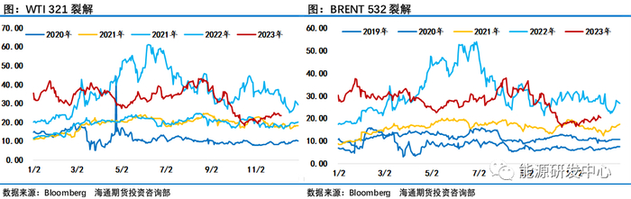 值得一提的是2023年原油市场的月间差走势,整个上半年月差波动较为平稳,反应了原油市场供需矛盾不突出,但下半年月差的波动反应了原油市场供需层面的大幅变化,三季度在沙特自愿减产带来供应紧张的推动下油价持续单边上涨,同期原油月间差也持续走高,尤其是9月之后月间差进入了加速冲高阶段,9月底随着库欣库存见底冲到了非常夸张的高度,随后又随着投资者对供需预期担忧升温,月差又迅速回落,即便是10月份巴以冲突爆发刺激了原油绝对价的短线反弹,带来了9美元的地缘溢价,月间差也没有跟随走强,相反月间差坍塌程度比绝对价表现更弱,显示了投资对供需层面从乐观快速转向悲观预期。