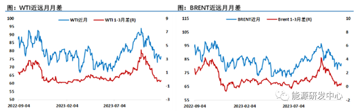 三季度:7月份开始沙特自愿减产100万桶/日,后续又几次延长了自愿减产措施,此举获得了俄罗斯减少石油出口的配合,8、9月份全球原油库存均出现了大幅去库的表现,这重新唤起了资金看涨原油的信心,虽然美国在短短一个月半月时间内将国内原油产量快速提升了100万桶/日,并放松对伊朗、委内瑞拉制裁等增加原油市场供应,但这些产量的回归在此期间并没有压制投资者的看涨热情,欧美市场持仓数据显示三季度原油市场投机净多头寸出现了急速的增加,在大量资金入场做多推动下油价从70美元涨到了95美元。尤其是9月下旬,随着库欣原油库存持续下跌已低于2200万桶,接近运营的最低水平,库欣库存“干涸”引爆了市场焦虑情绪,这让WTI原油近期交割的溢价随后达到2美元,为2022年7月以来的最高水平。WTI、布伦特原油均突破了95美元SC原油突破750元关口,各大油种均刷新年内高点,这也成为油价年内的“高光时刻”。