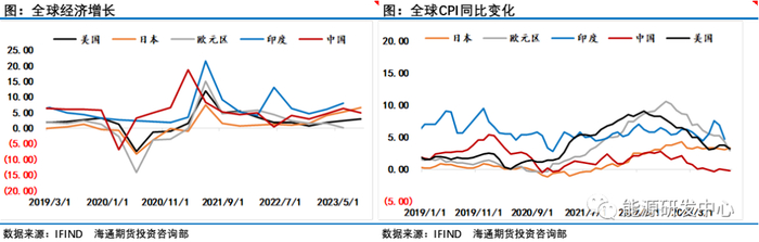 IMF方面认为全球经济目前的特征是增长疲弱、经济分化和分歧加深,严重冲击正在成为新常态,预计利率将在更长时间内保持较高水平,以抑制持续高企的通胀。总体通胀继续放缓,按同比计算,预计将从2022年的9.2%下降至今年的5.9%和2024年的4.8%。核心通胀(不包括粮食和能源价格)预计也将下降,不过速度慢于总体通胀,2024年将达到4.5%。多数国家的通胀在2025年之前不太可能回到目标水平。目前市场普遍判断2023年年底欧美加息周期基本结束,经济逐渐筑底。市场预期为2024年上半年美联储开始进入降息周期,我们认为市场炒作有过早的可能,在美国经济韧性较强、通胀未达到联储目标时,联储可能会长期保持高利率的环境,2024年下半年缓慢进入降息周期的可能性或许更大。