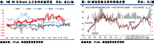 我们喜欢用5年作为一个周期来做总结或做计划,2023年,对国内原油期货来说上市已经满五周年了,经过了5年的成长,我国SC原油作为区域性基准油开始逐渐有了自己的特色。一方面SC充分体现了人民币汇率变化。今年在美联储强力加息影响下,国际汇率市场变化巨大,人民币汇率也是在这一背景下出现了10%的大幅波动,而用人民币计价的SC原油的价格波动就充分的体现了这一变化,在三季度这一波大涨过程,SC的涨幅远超欧美市场。二是SC充分反应了中国代表的东北亚区域供需变化和预期。三季度中国炼油加工量不断刷新历史记录的阶段,旺盛的需求叠加供应紧张让SC表现持续强于布伦特原油。而时间进入四季度我们可以明显看到SC原油表现弱于海外其他区域油种表现,一方面中国经济面临较大压力,同时高油价对需求形成抑制;另外中国进口配合也基本用完,地炼在炼油利润走弱背景下调降开工率,中国炼油量从高位回落明显。SC原油走势明显弱于中东阿曼原油,与Brent价差持续滑落至目前约-5美元/桶。经我们对SC的理论价和实际价进行测算,发现自11月以来SC盘面的实际价格持续脱离理论价,估值程度严重被低估,意味着投资者对原油市场后市的悲观预期。另外我们也注意到在今年11月初中国SC原油率先选择了方向,走出了破位下行行情,领跌全球市场,这对SC原油确立市场地位具有重要意义。