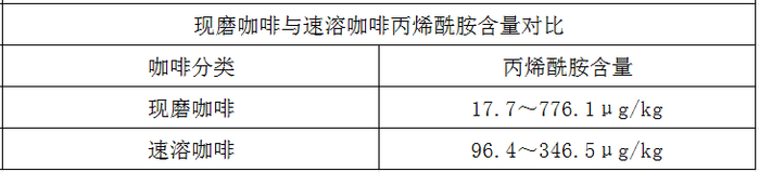 而速溶咖啡为咖啡豆烘焙、研磨、萃取后,进行适当浓缩,再通过喷雾干燥或冷冻干燥得到速溶咖啡粉。速溶咖啡的香气与风味都比不上现磨咖啡,并且预干燥、喷雾干燥等环节会导致一部分丙烯酰胺的挥发,所以速溶咖啡的丙烯酰胺含量一般低于现磨咖啡。