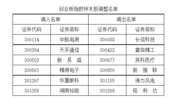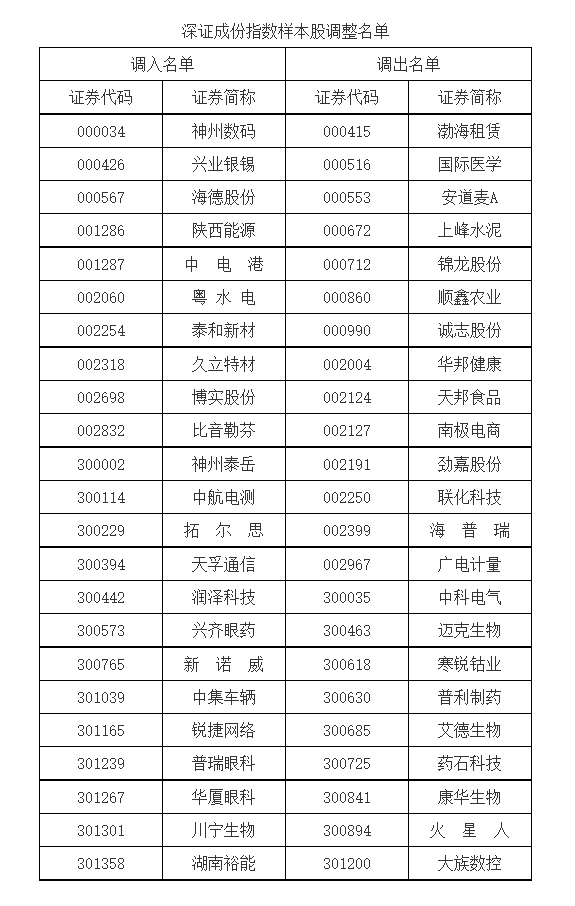 深市此次主要对深证成指、创业板指、深证100实施样本股定期调整。其中,深证成指将更换23只样本股,调入主板公司10家,创业板公司13家;创业板指将更换6只样本股;深证100将更换3只样本股,调入主板公司2家,创业板公司1家。
