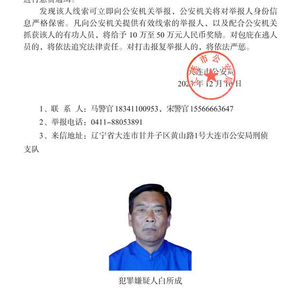 ▲大连市公安局发布《关于对电信网络诈骗犯罪在逃人员白所成的悬赏通告》。图/公安部网站