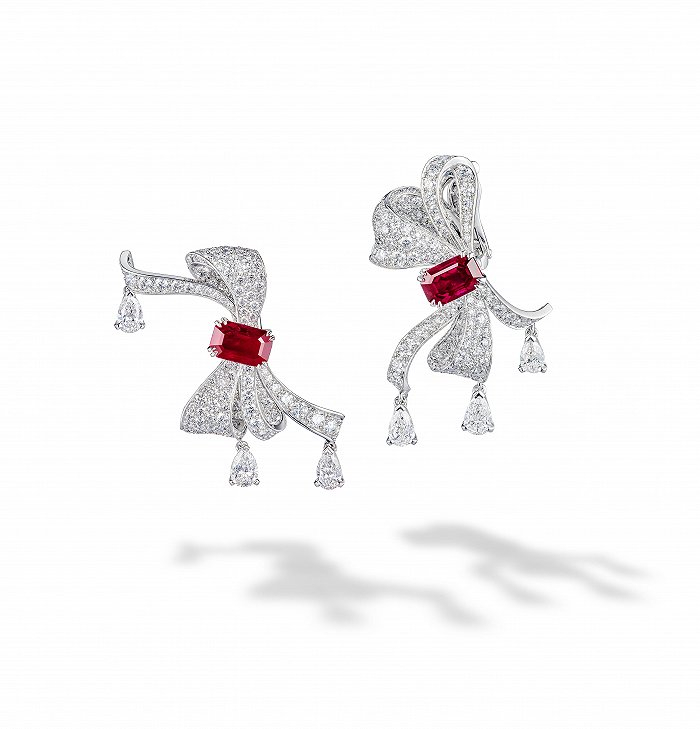 ANNA HU 印象春兰红宝耳环甄选心形切割、色泽浓郁迷人的缅甸鸽血红红宝为主石,Anna亲自绘制设计每片花瓣各自以不同姿态优雅舒展,18K 金底座运用古典法式镶嵌工艺,让闪烁钻石化作园中娇艳绽放的美丽春兰,Briolette 切工悬挂式水滴形钻石灵巧摆动、翩跹闪烁,展现出花朵在风中摇曳生姿的婀娜姿态,更犹如蕴含着音符跳跃的迷人节奏,在冬日星光中翩翩起舞。