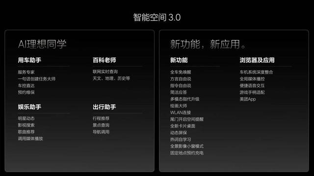 除了得到大模型赋能后新增更多角色,理想同学的底层素质也再次得到提升,听感和执行能力全面进化。SS 3.0为理想同学带来了全时全车免唤醒能力,不用说出唤醒词,就可以直接向理想同学发出常用的语音指令。理想同学也新增了指令自由说功能,一句话中如果包含多项指令,理想同学可以逐一识别,并陆续执行。升级SS 3.0后,理想同学的语音回应还将支持“话更少”的简洁模式,方言自由说支持的范围也再度扩充,多项新功能结合,显著提升用户和理想同学间的对话效率。