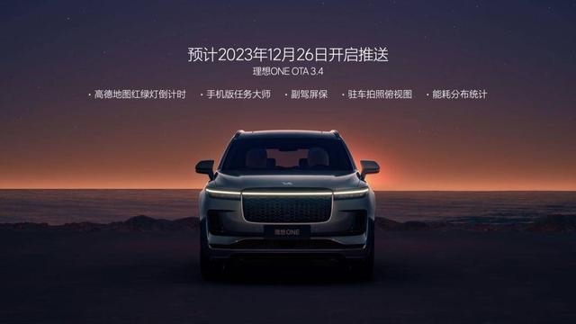 同时,理想ONE的OTA 3.4也计划于12月26日开启推送,新增高德地图红绿灯倒计时、手机版任务大师、副驾屏保、驻车拍照俯视图和能耗分布统计等功能。