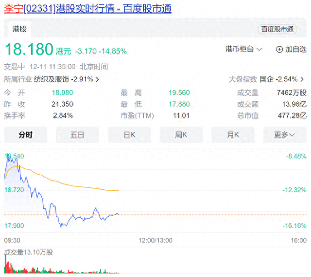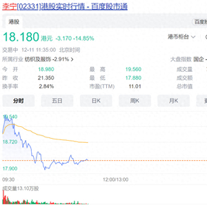 12月11日港股盘中,李宁一度大跌超16%,刷新2020年3月以来新低,成交额超10亿港元。