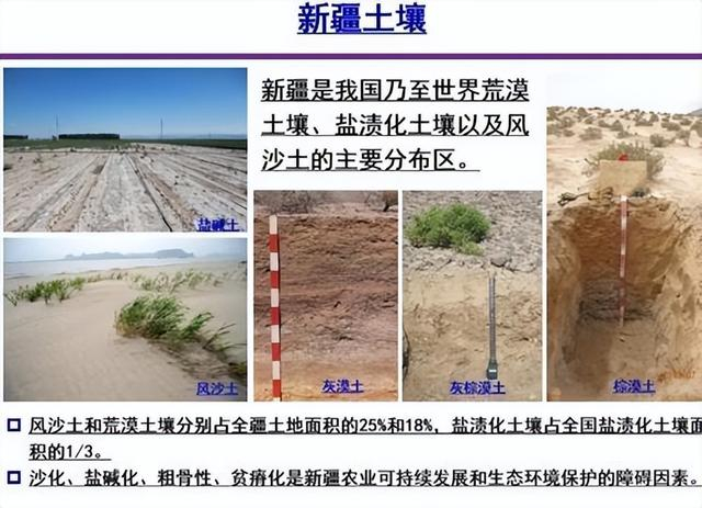 新疆是我国乃至世界荒漠土壤、盐渍化土壤以及风沙土的主要分布区,风沙土和荒漠土壤分别占全疆土地面积25%和18%,盐渍化土壤占全国盐渍化土壤积的1/3。
