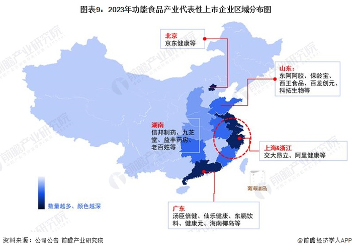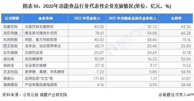 从代表性企业分布情况来看,广东、山东等地代表性企业较多。汤臣倍健、仙乐健康、东鹏饮料等代表企业分布在广东地区;东阿阿胶、保龄宝等主要分布在山东地区。