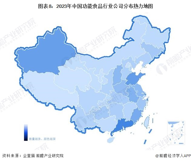 根据企查猫以“食品制造业”为选定行业,以“功能食品”为关键词进行搜索,得到我国功能食品行业企业区域分布来看。具体来看,功能食品行业产业链企业主要分布在华南地区,其次是在华东、华北等地区;其余地方,如甘肃、黑龙江、内蒙古、西藏等省份虽然有企业分布,但是数量极少。