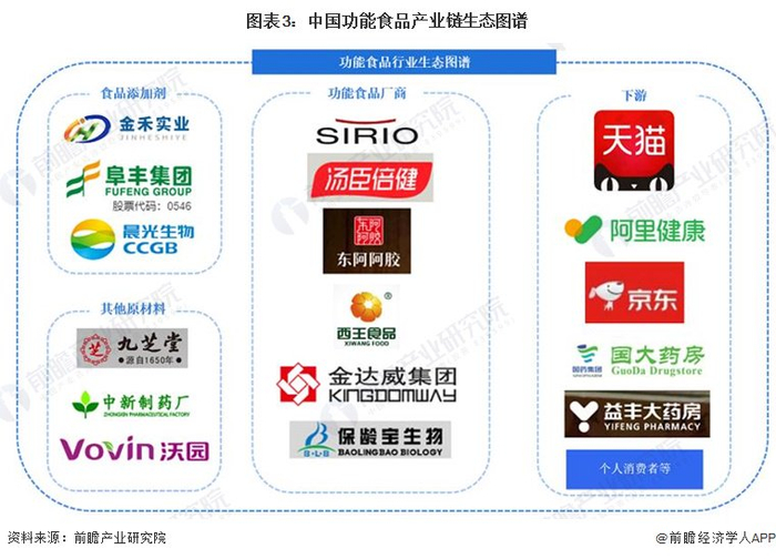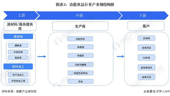 功能食品概念相关产业按价值链自上而下主要可分为三大部分:即上游原材料及原料加工、中游功能食品生产及下游零售环节。上游原材料包括糖醇类、中药材、果蔬等。原材料加工则主要包括农产品加工、中药材加工等;中游部分按照功能食品种类可以分为功能饮料、保健酒、保健茶、功能性糖果、功能性食用油等;下游部分根据销售渠道的不同,包括有经销商、连锁药店、电商平台等。