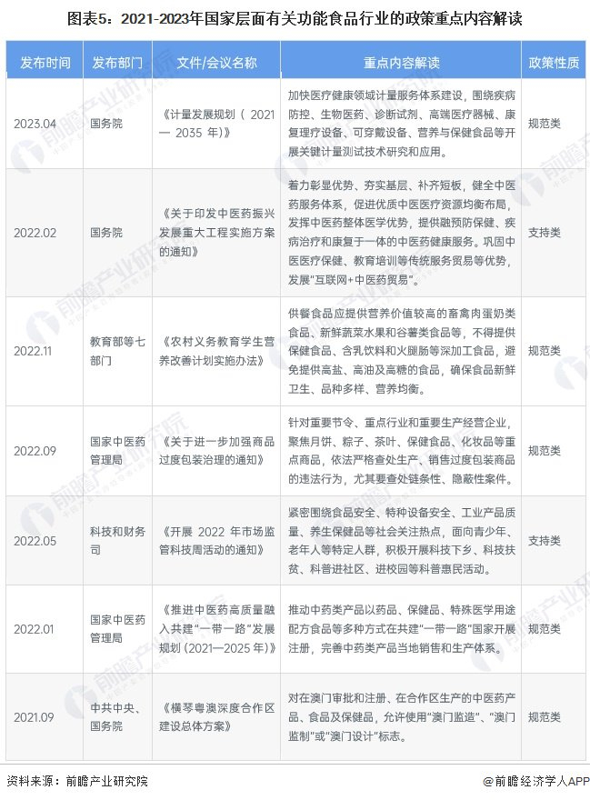 2021-2023年我国颁布的多项政策多为我国功能食品行业的规范性法规,从功能食品标签、宣传、功能食品安全等方面对我国功能食品行业发展提出了要求。具体政策如下: