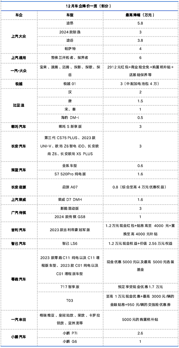 根据第一财经记者统计,在年底官宣降价的车企至少达16家,包括上汽大众、比亚迪、长安汽车、智己汽车、零跑汽车、上汽荣威、吉利汽车、广汽传祺、小鹏汽车等,其中上汽大众途昂最高降幅达5.8万元,小鹏P7i全系至高优惠2.6万元。