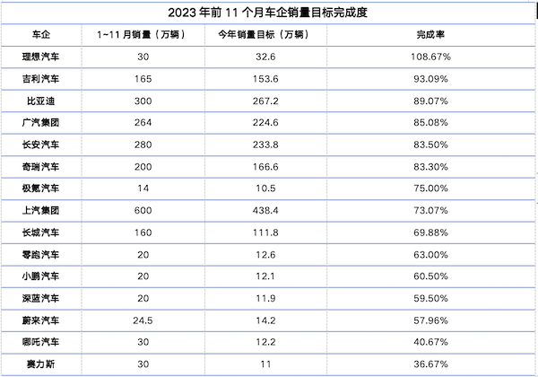 值得注意的是,哪吒汽车和赛力斯的销量目标完成率分别为40.67%和36.67%,甚至不到一半。