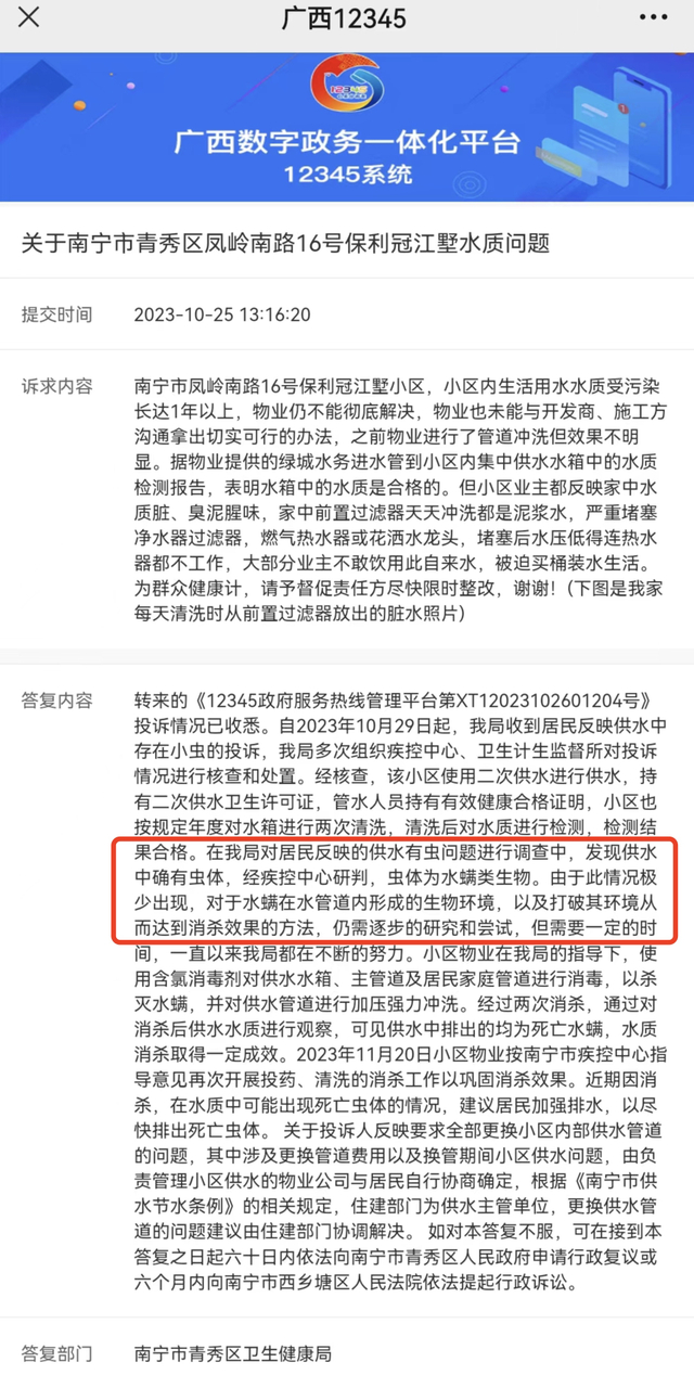 南宁市青秀区卫生健康局在12345平台上回复:经核查,该小区使用二次供水进行供水,持有二次供水卫生许可证,管水人员持有有效健康合格证明,小区也按规定年度对水箱进行两次清洗,清洗后对水质进行检测,检测结果合格。在我局对居民反映的供水有虫问题进行调查中,发现供水中确有虫体,经疾控中心研判,虫体为水螨类生物。