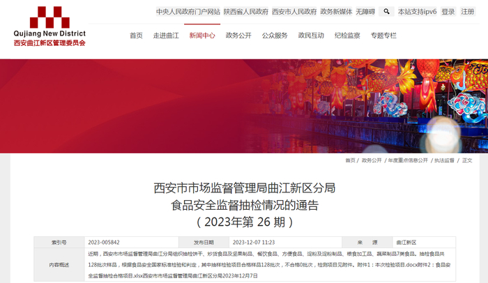 西安市市场监督管理局曲江新区分局食品安全监督抽检情况的通告(2023年第 26 期)