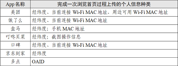 (5)在后台静默场景中,个人信息上传种类最多的为美团和盒马(均为2类)。具体情况如表11。