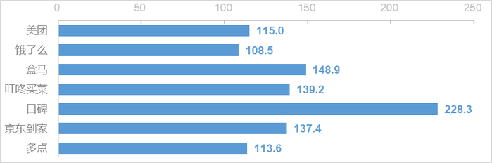 (1)7款App在用户完成一次外卖商品选购活动(启动App、浏览首页、搜索商品、选购商品)时,上传数据流量平均⁽³⁾最多的为口碑,约为228KB;平均最少的为饿了么,约为109KB。具体情况如图1。