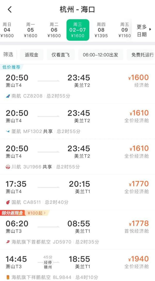 2月7日、8日,杭州飞海口夜间时段经济舱机票数量已经不多。比如:杭州飞海口,目前12月还有470元的特价票,1月起价格逐步上升,到1月底票价将突破1000元。