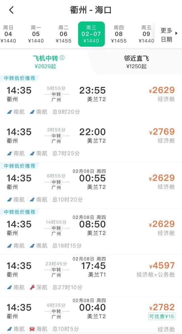 到2月7日、8日,也就是腊月廿八、廿九,由于临近春节长假,杭州、衢州、上海飞海口航线经济舱票价普遍逼近2000元,甚至更高。