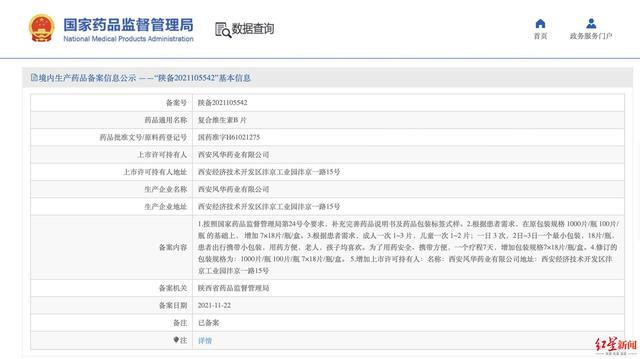 就此,红星新闻在国家药品监督管理局检索发现,西安风华药业有限公司于2021年11月22日在陕西省药品监督管理局对复合维生素B片进行备案,备案内容显示,根据患者需求,该厂家在原包装规格1000片/瓶及100片/瓶的基础上,为了用药安全、携带方便,根据7天一个疗程,增加7×18片/瓶/盒包装规格。
