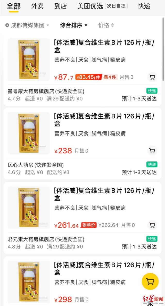此外,红星新闻还注意到,在线上网购平台页面中,这款剂量126片、包装也一样的维生素B族,不同药店标价跨度较大,从最低优惠后的83元,到最高298元一瓶不等。