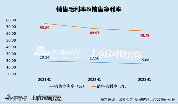 除此之外,近三年上半年销售毛利率、销售净利率更是持续下降。公司销售毛利率由2021H1的55.89%下降至2023年H1的48.78%,销售净利率由2021H1的19.14%下滑至2023年H1的15.08%。