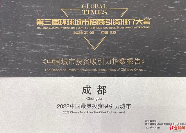 4月2日,第三届环球城市招商引资推介大会在北京举行,同时发布的“中国城市美好生活新发展——中国城市投资吸引力指数报告”显示,成都位居“2022中国最具投资吸引力城市”第一名,实现了十连冠。