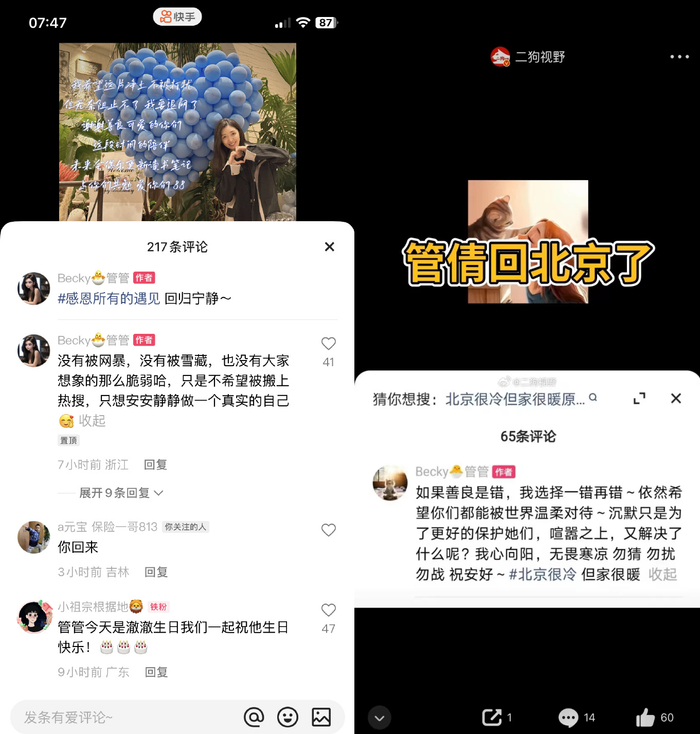 12月3日,管倩突然将其快手账号ID改名为“后悔有期:)”,账号签名改为“再见喧嚣,回归平凡世界做自己,继续热爱生活”,并清空了该账号下的所有内容。
