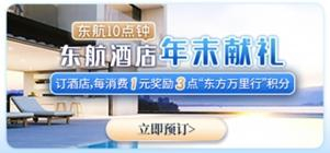 东航酒店年末献礼,即日起至2023年12月31日期间,每日上午10:00-11:00,“东方万里行”会员通过东航官网、APP“惠价酒店”频道预订酒店,即可享受每消费1元人民币获赠3点“东方万里行”积分;