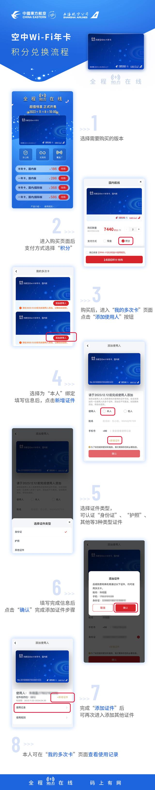 为让更多旅客体验该产品,东航空中Wi-Fi年卡新增里程积分兑换功能,其中国内版半年卡有效期180天,价值7440积分,一年卡11440积分,涵盖中国内地和港澳台地区所有宽体机航班;国内/国际版半年卡14720积分,一年卡23440积分。“东方万里行”会员通过东航APP等渠道,在支付方式处选择“积分”即可抢购。购买后进入“我的多次卡”页面,点击“添加使用人”,按屏幕指引即可完成绑定,与现金购买同样便捷。