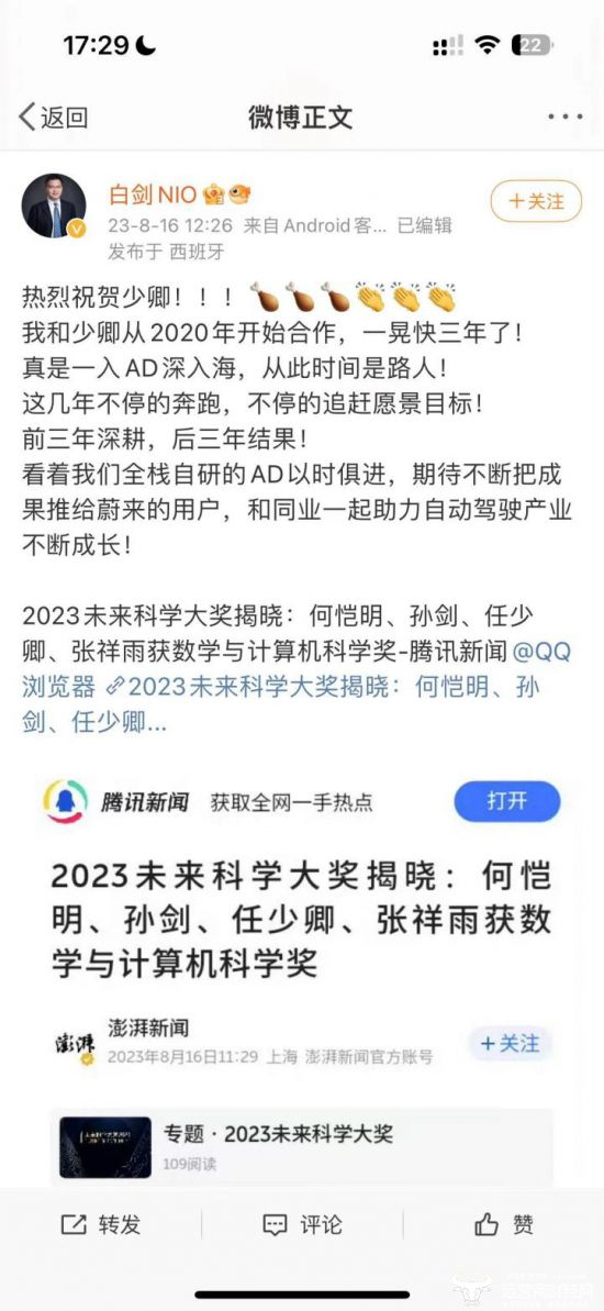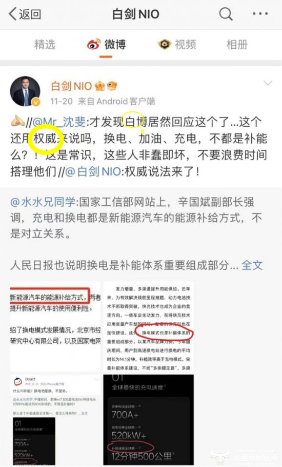 而此前,白剑还在社媒平台和蔚来电源管理副总裁沈斐进行了互动。沈斐公开称赞夸赞白剑是权威。