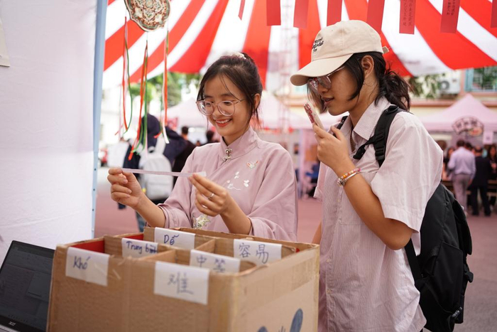 2023年11月1日,在越南河内大学,越南大学生在“同唱一首歌”中国—东盟青年影视歌会活动现场参与猜谜语游戏。(新华社记者胡佳丽摄)